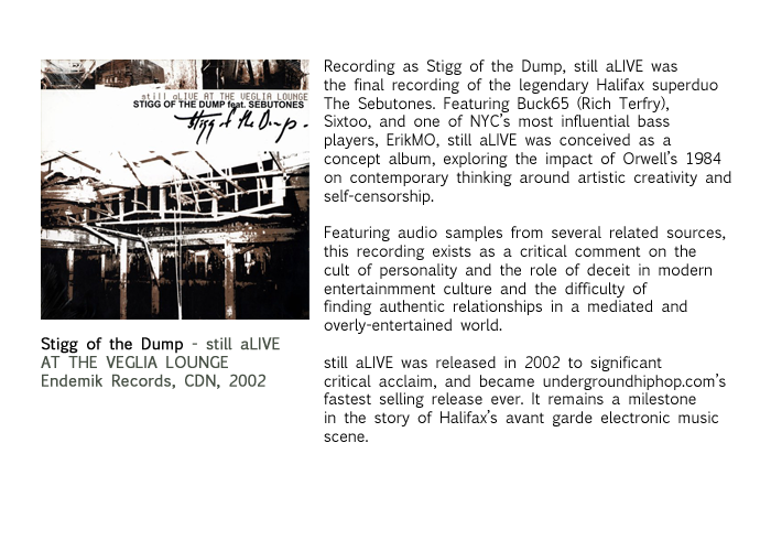 It's a given that Sebutones, Buck 65 and Sixtoo sound best over their own production, but with Still Alive..., Halifax, NS, beatsmith Stigg of the Dump provides them with their best outside production yet ....